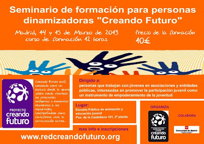 Por esos motivos, no hemos querido dejar pasar mucho tiempo para organizar esta formación de personas dinamizadoras de Creando Futuro. La formación será los días 14 y 15 de marzo, en la Escuela de Animación de la Comunidad de Madrid (Paseo de la Castellana, 101. 2º Planta. MAPA). La formación tendrá una duración de 12h.