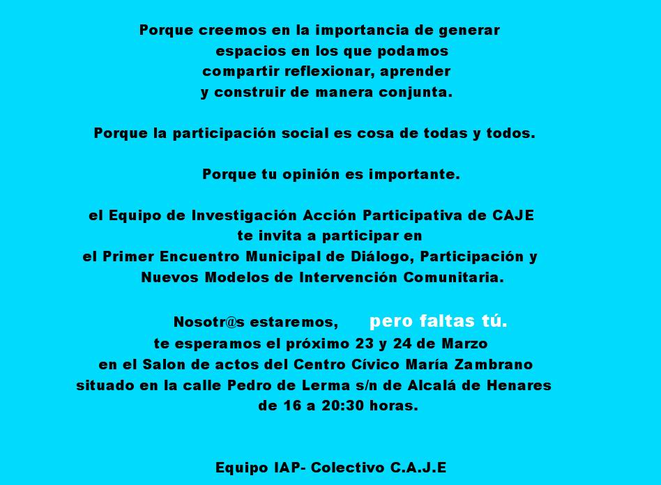 Primer Encuentro Municipal de Diálogo, Participación y Nuevos Modelos de Trabajo e Intervención Comunitaria (en colaboración con el Excmo. Ayto. de Alcalá de Henares) ,que tendrá lugar los días 23 y 24 de Marzo de 16 a 20:30 horas, en el salón de actos del Centro Cívico María Zambrano, c/ Pedro de Lerma s/n Alcalá de Henares.